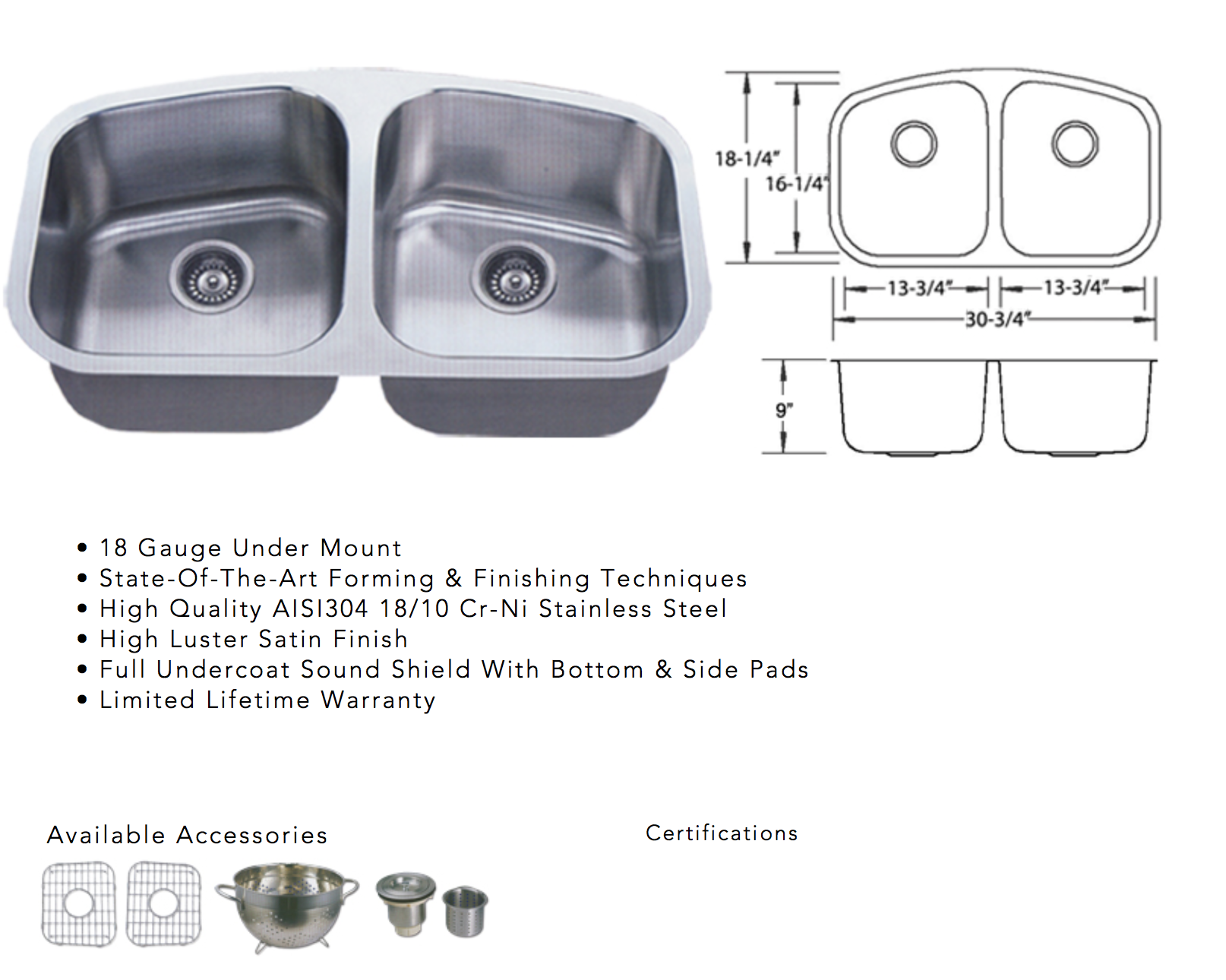 • Highest Quality Type 304 Culinary Stainless Steel • 18 Gauge Steel • 18/10 CrN i Content • Full Undercoating & Sound-Dampening • Brushed Finish – Durable & Elegant • Limited Lifetime Warranty